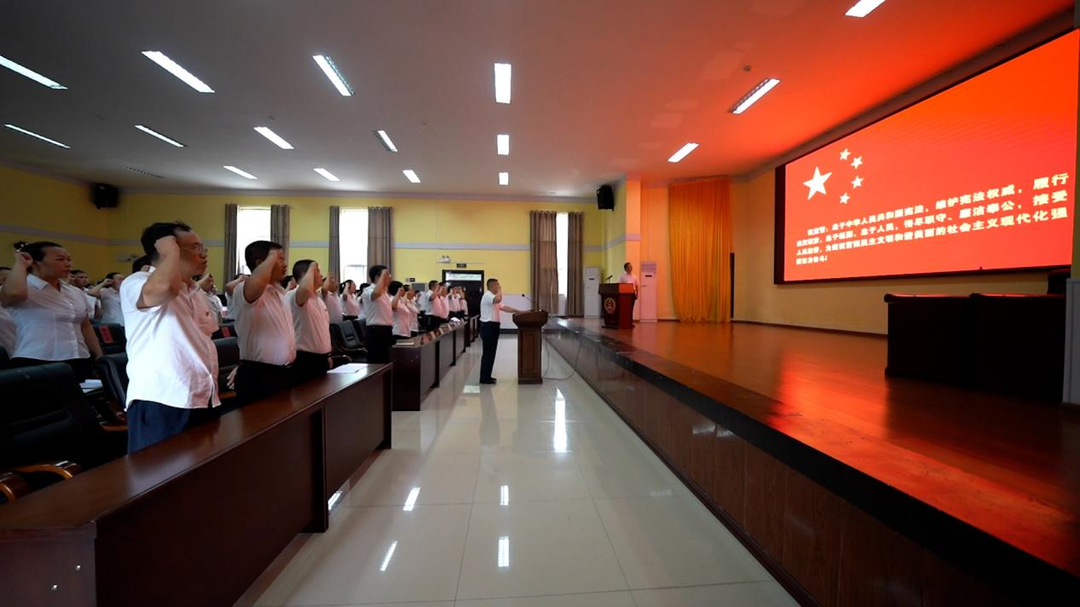 宣誓仪式上,领誓人左手抚按宪法,右手举拳,领诵誓词,其他宣誓人整齐排列,右手举拳,跟诵誓词。铿锵洪亮的誓词响彻全场,传递着弘扬宪法精神、履行宪法使命的坚定决心。
