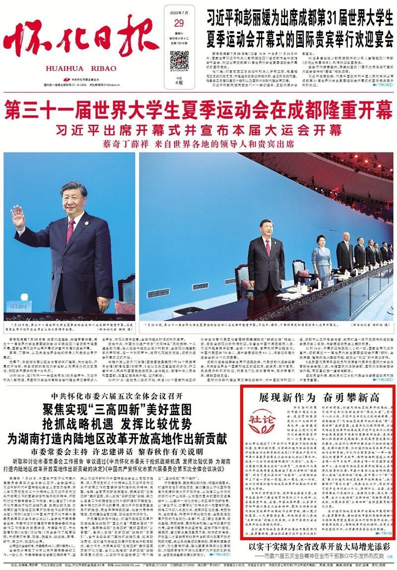 7月28日胜利闭幕的市委六届五次全会,是在贯彻落实党的二十大精神开局之年、全面建设社会主义现代化新怀化关键时期召开的一次重要会议。会议审议通过了《中共怀化市委关于抢抓战略机遇 发挥比较优势 为湖南打造内陆地区改革开放高地作出新贡献的决定》《中国共产党怀化市第六届委员会第五次全体会议决议》等文件。这是一次与时俱进谱新篇的“大谋划”,也是一次重整行装再出发的“大动员”,为推动怀化高水平开放高质量发展描绘了更加清晰的“路线图”、制定了更加具体的“任务书”,必将推动全市上下进一步统一思想、统一意志、统一行动,全力为湖南打造内陆地区改革开放高地作出新的更大贡献。