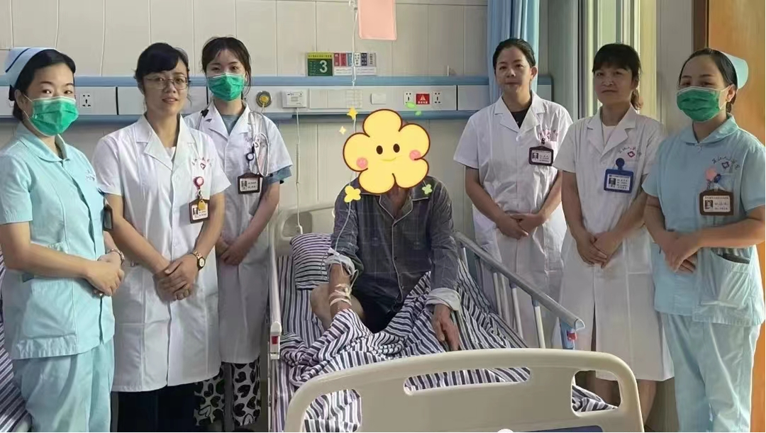 (身体康复中的杨爷爷和参与救治的医护人员合影)