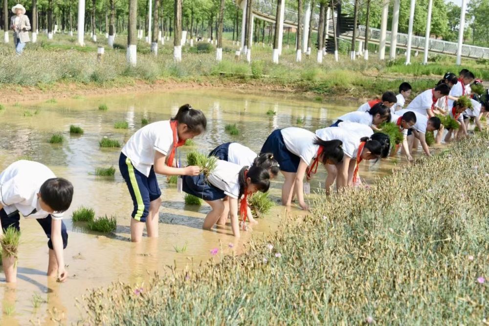2023年5月12日,澧县城头山国家考古遗址公园内,小学生们在移栽水稻秧苗。(柏依朴 摄)