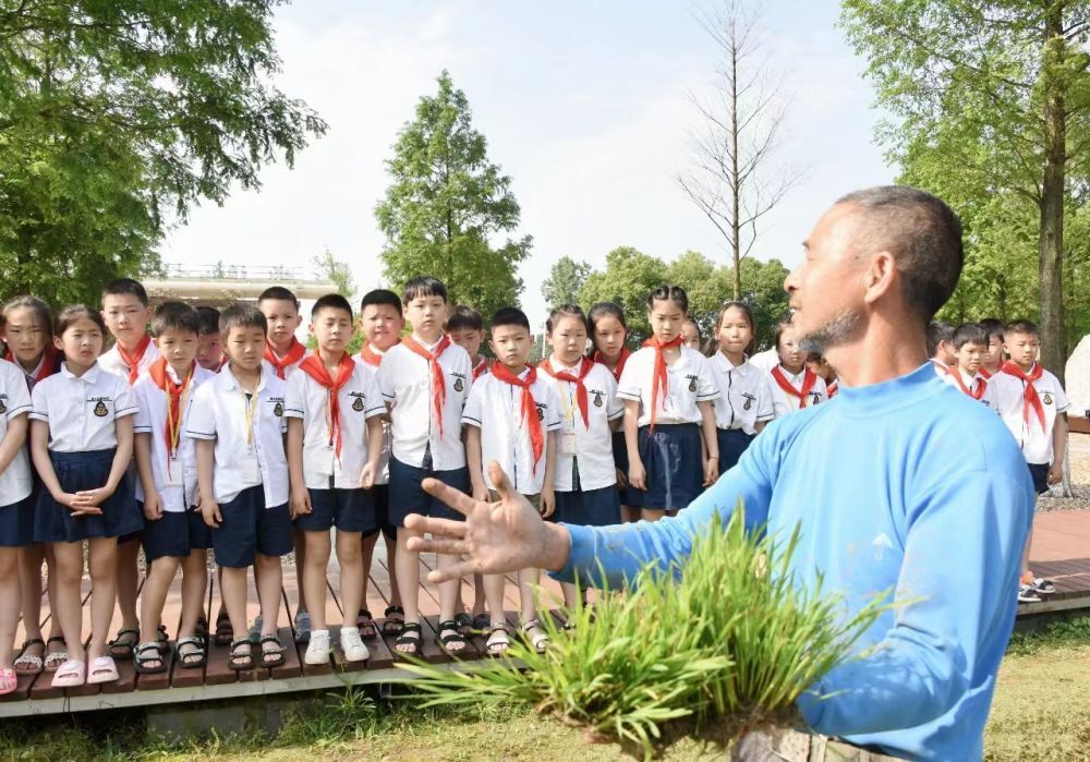 2023年5月12日,澧县城头山国家考古遗址公园内,老农现场教小学生水稻秧苗移栽要领。(柏依朴 摄)