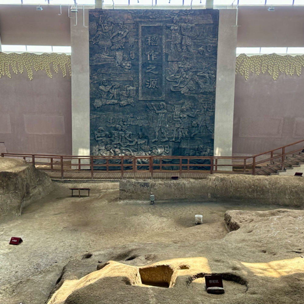 遗址展馆内景,石墙上的“稻作之源”引人注目。新华社记者郁葱 摄