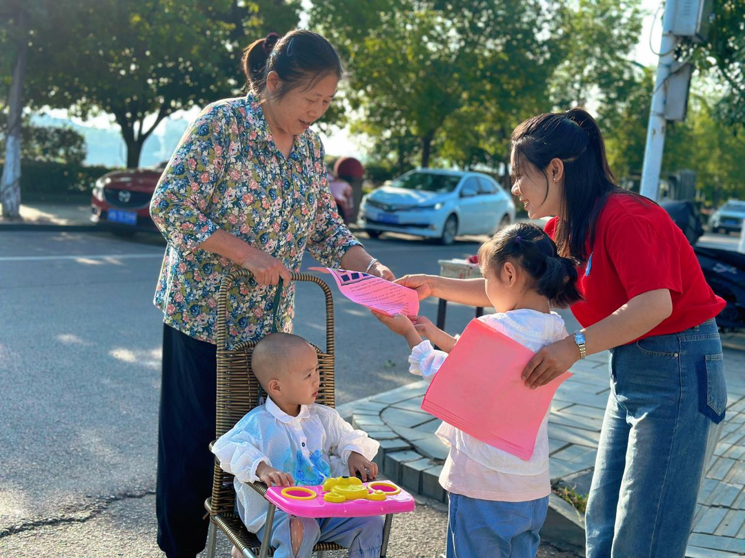 大班的孩子们在老师的带领下,作为“小小推普员”在幼儿园附近,为居民和家长发放推普宣传单。
