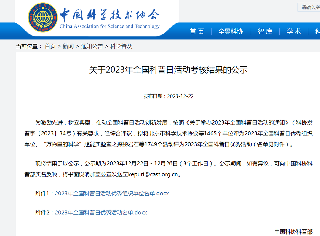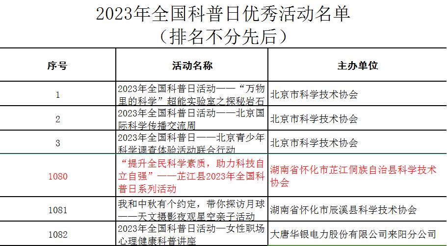 芷江融媒讯(通讯员 宋玲)日前,中国科协公布了2023年全国科普日活动考核结果,由芷江科协主办并推荐的芷江2023年全国科普日系列活动获评2023年全国科普日优秀活动。