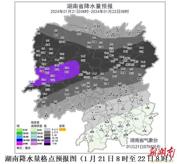 记者上午9时30分联系上了省气象局,得到最新情况:受高空槽、中低层切变和强冷空气共同影响,今天开始省内有一次低温雨雪冰冻天气过程,21日湘西、湘中有大到暴雪、局地大暴雪,22日湘南有中到大雪、局地暴雪,高海拔山区有冻雨。
