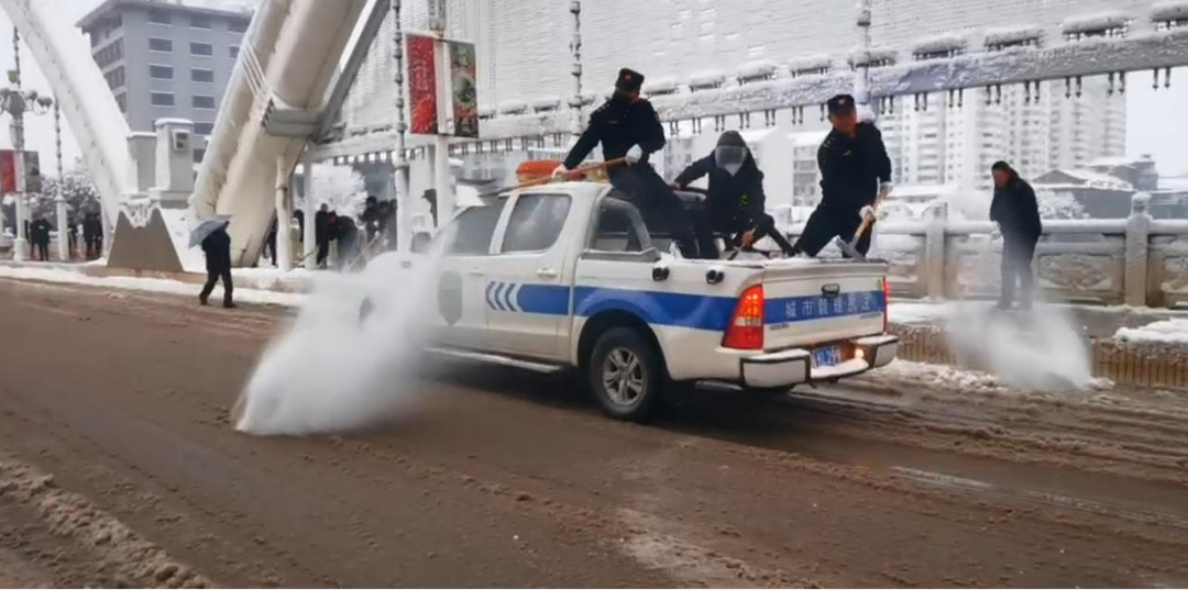 截至目前,该局共出动人员150人次,车辆12台,抛洒工业盐2吨,实现了城区积雪积冰的快速有效处理。