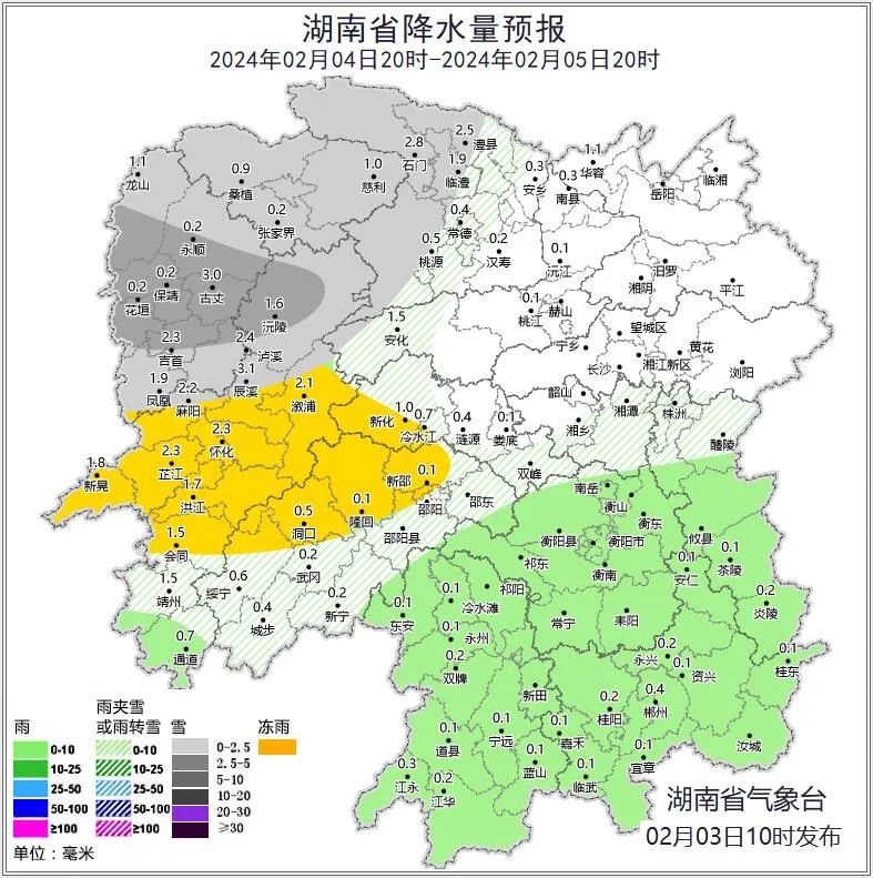 预计3日20时至4日20时,常德、张家界、益阳、怀化东北部、湘西州已出现雨凇或积雪,上述地区未来24小时仍将出现雨凇或积雪,且最低气温≤-2℃,请注意防范。