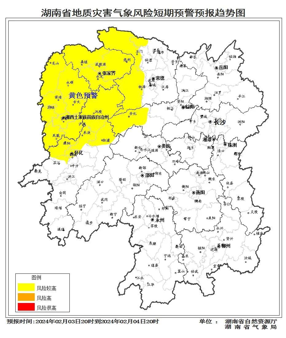 根据地质灾害成灾规律和孕灾条件,结合2024年2月3日短期气象预报情况,省自然资源厅与省气象局联合会商得出如下结论:自2月3日20:00至4日20:00,受低温雨雪冰冻灾害天气影响,湘西大部分区域发生突发性地质灾害风险较高(黄色预警)。