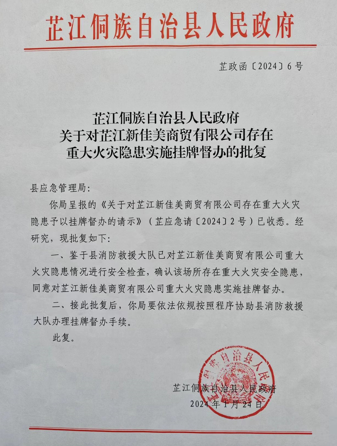 芷江融媒讯(通讯员 刘慧婷)为深入推进除患攻坚大整治工作,确保全县火灾形势持续平稳,近日,芷江侗族自治县人民政府下发《关于对新芷江新佳美商贸有限公司存在重大火灾隐患实施挂牌督办的批复》,同意对芷江新佳美商贸有限公司实施挂牌督办,整改火灾隐患。