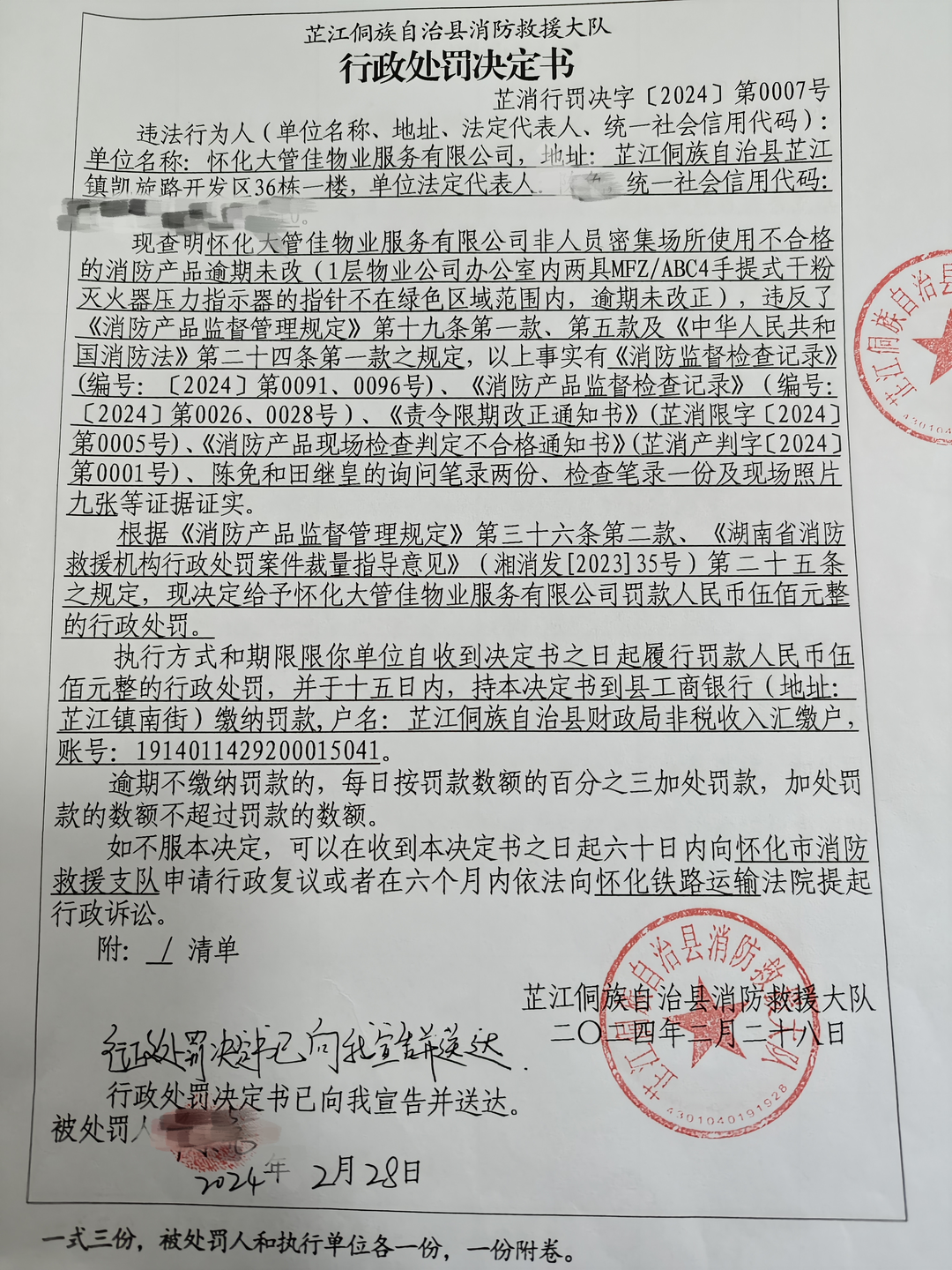 前期,大队监督检查员在对怀化大管佳物业进行检查时,发现该物业办公室内两具干粉灭火器压力指示器指针不在绿色范围内。对此,大队监督执法人员当场下发了《责令限期改正通知书》,要求单位限期内将隐患整改到位。到期复查时,检查员发现隐患仍然存在,随即再次下发《责令限期改正通知书》并根据《消防产品监督管理规定》第三十六条第二款、《湖南省消防救援机构行政处罚案件裁量指导意见》第二十五条之规定对该单位处以罚款人民币伍佰元、法人罚款人民币壹佰元的行政处罚。