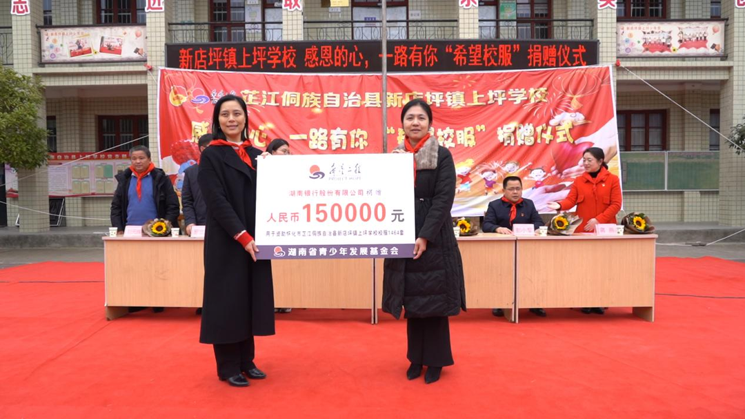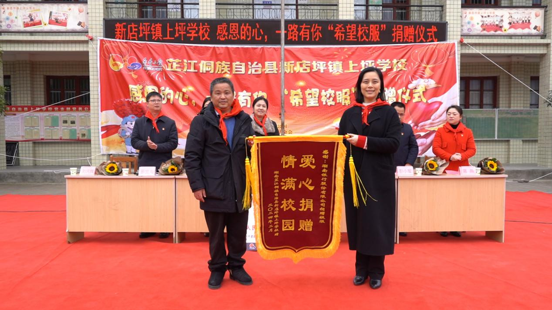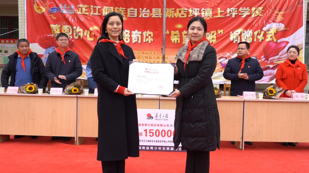 湖南银行股份有限公司党委宣传部副部长、行团委书记符丽群向湖南省希望工程办公室副主任、湖南省青少年发展基金会副理事长兼秘书长余秋璇递交了捐赠牌,象征着这份温暖的传递与接力。余秋璇秘书长也向符丽群颁发了荣誉证书,以表达对其善举的肯定与感谢。