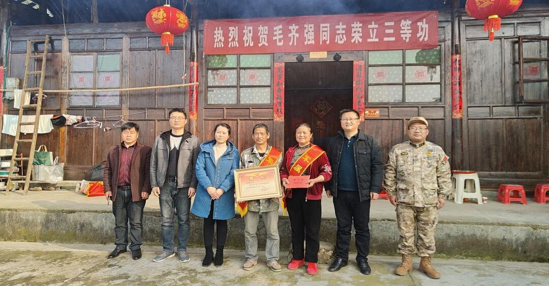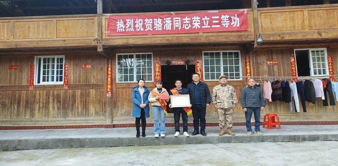 芷江融媒讯(通讯员 龙家海 李梦夏)为弘扬拥军优属光荣,营造关爱功臣模范的社会氛围,3月7日,芷江侗族自治县退役军人事务局负责人与土桥镇党委负责人等相关人员,先后前往土桥镇马田村骆秀艳和洞下村毛瑞均家,为立下三等功的现役军人骆潘、毛齐强家属送去喜报、奖励金,给家属披戴红绶带并挂上祝贺横幅。