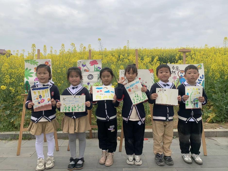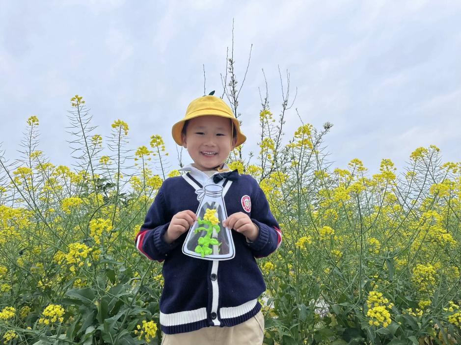 孩子们在老师的带领下走进油菜田间,看着花朵,闻着花香,“油菜花比我还要高呢”“油菜花好香好香呀”“我发现花上有四个花瓣”……孩子们用自己独特的视角观察世界。他们拿着画笔、颜料、黏土置身花海,用自己的方式记录着春天的色彩。
