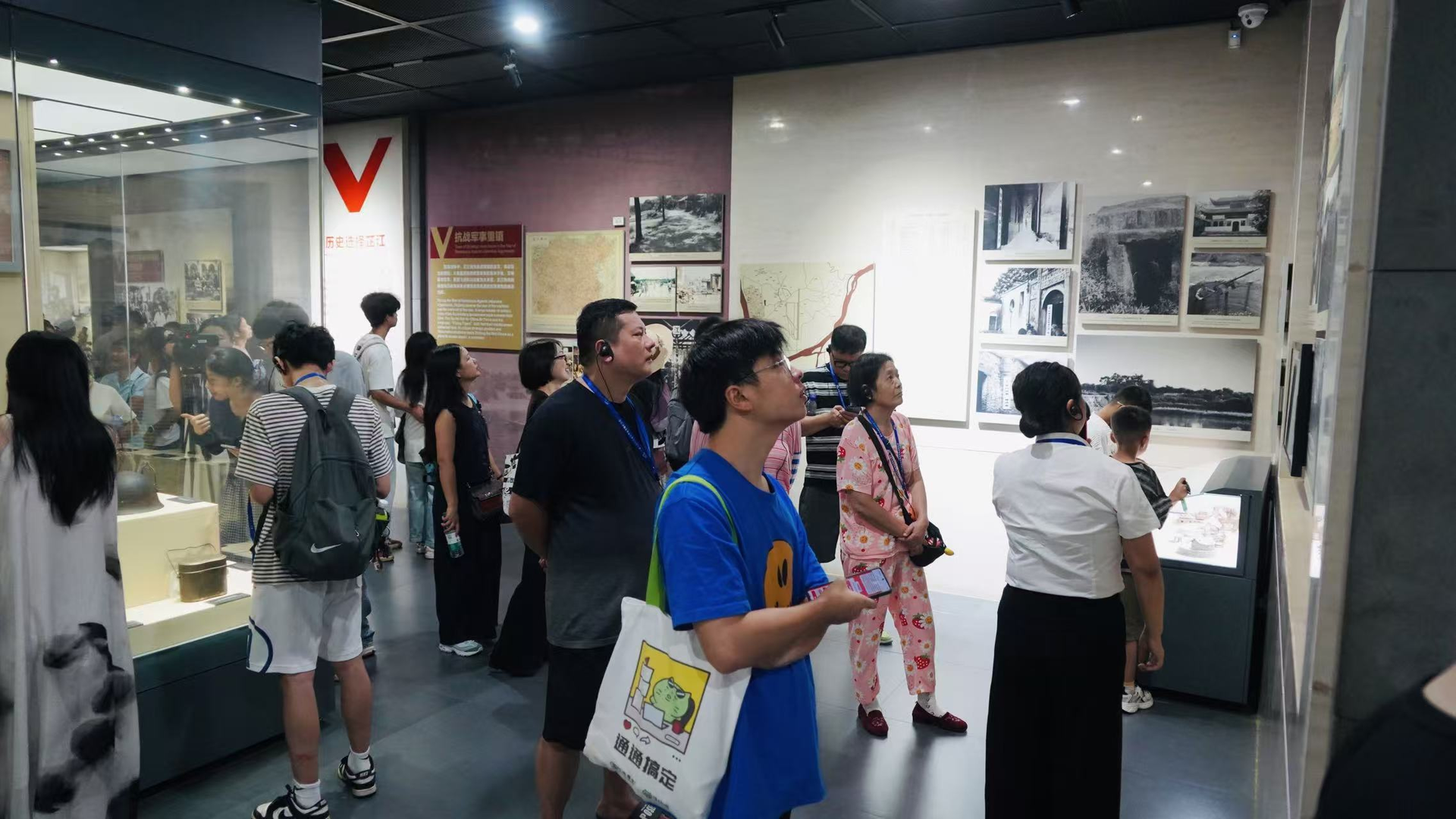 记者看到,在中国人民抗日战争胜利受降纪念馆的入口处已排起长队。各个展厅里的历史照片和革命文物吸引不少游客驻足观看。