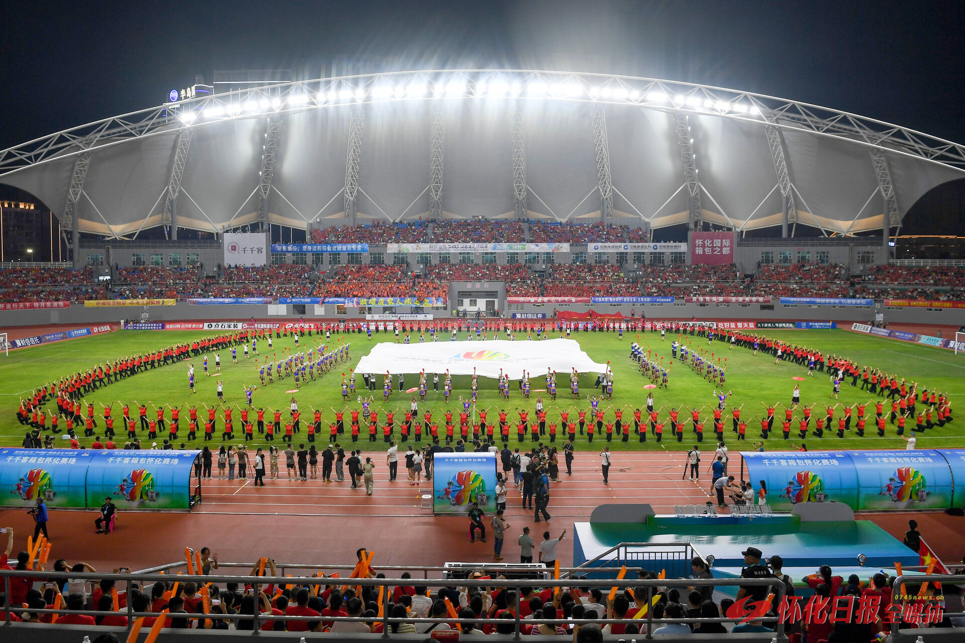 (10月4日晚,“湘超”常规赛第四轮——怀化赛区主场首场比赛在怀化体育中心打响。图为赛前文艺表演)