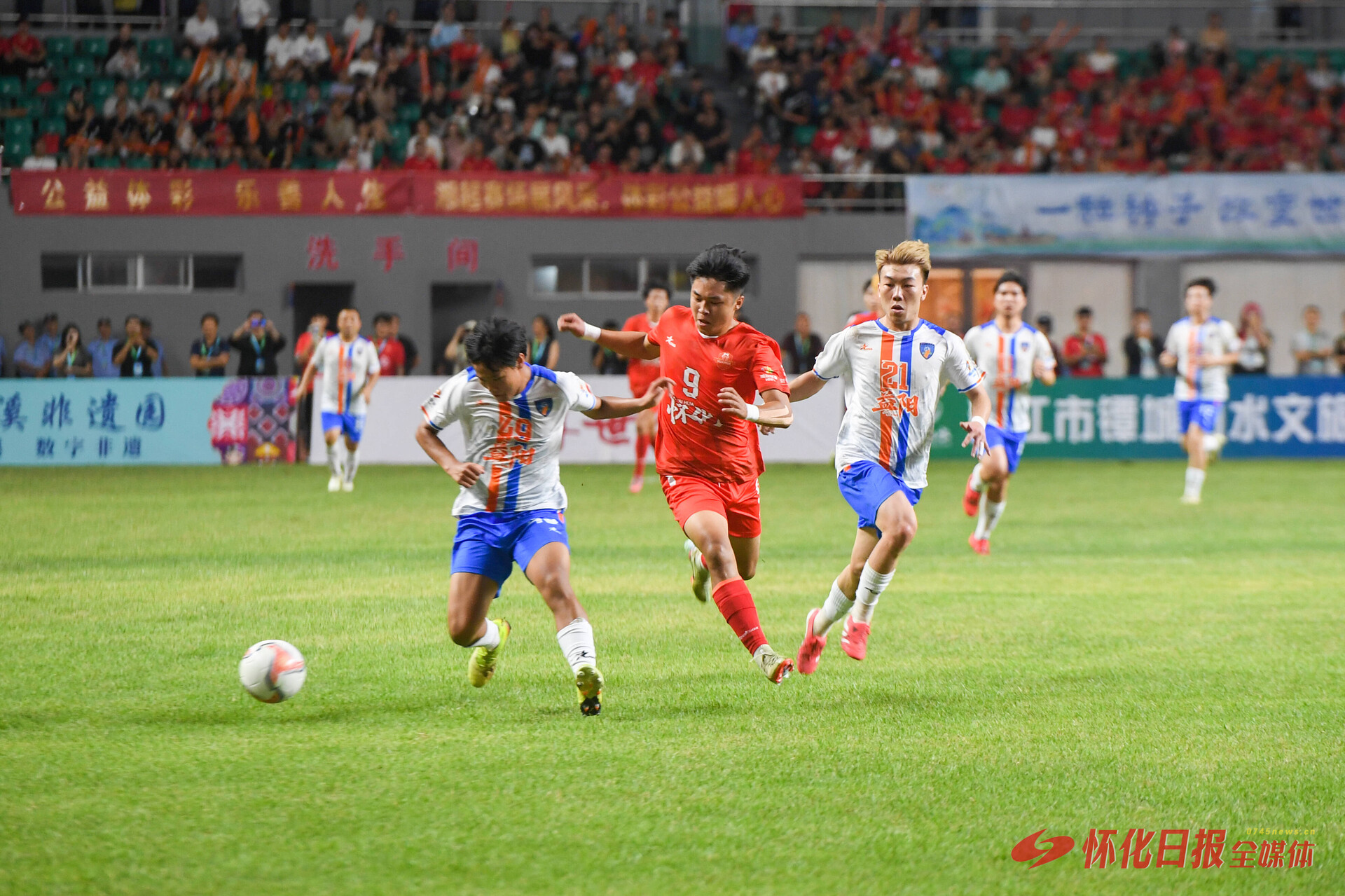 19时38分,随着主裁判一声哨响,比赛正式打响。上半场益阳队率先破门,取得1∶0领先优势。下半场,落后的怀化队调整战术、顽强进攻,终于在伤停补时阶段打入湘超首个进球,1∶1绝平益阳队。