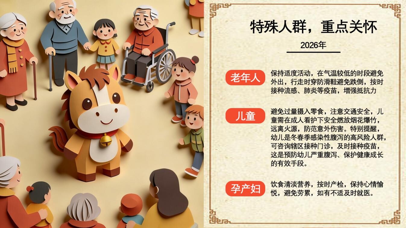 儿童:避免过量摄入零食,注意交通安全,儿童需在成人看护下安全燃放烟花爆竹,远离火源,防范意外伤害。特别提醒,幼儿是冬春季感染性腹泻的高风险人群,可咨询辖区接种门诊,及时接种疫苗,这是预防幼儿严重腹泻、保护健康成长的有效手段。