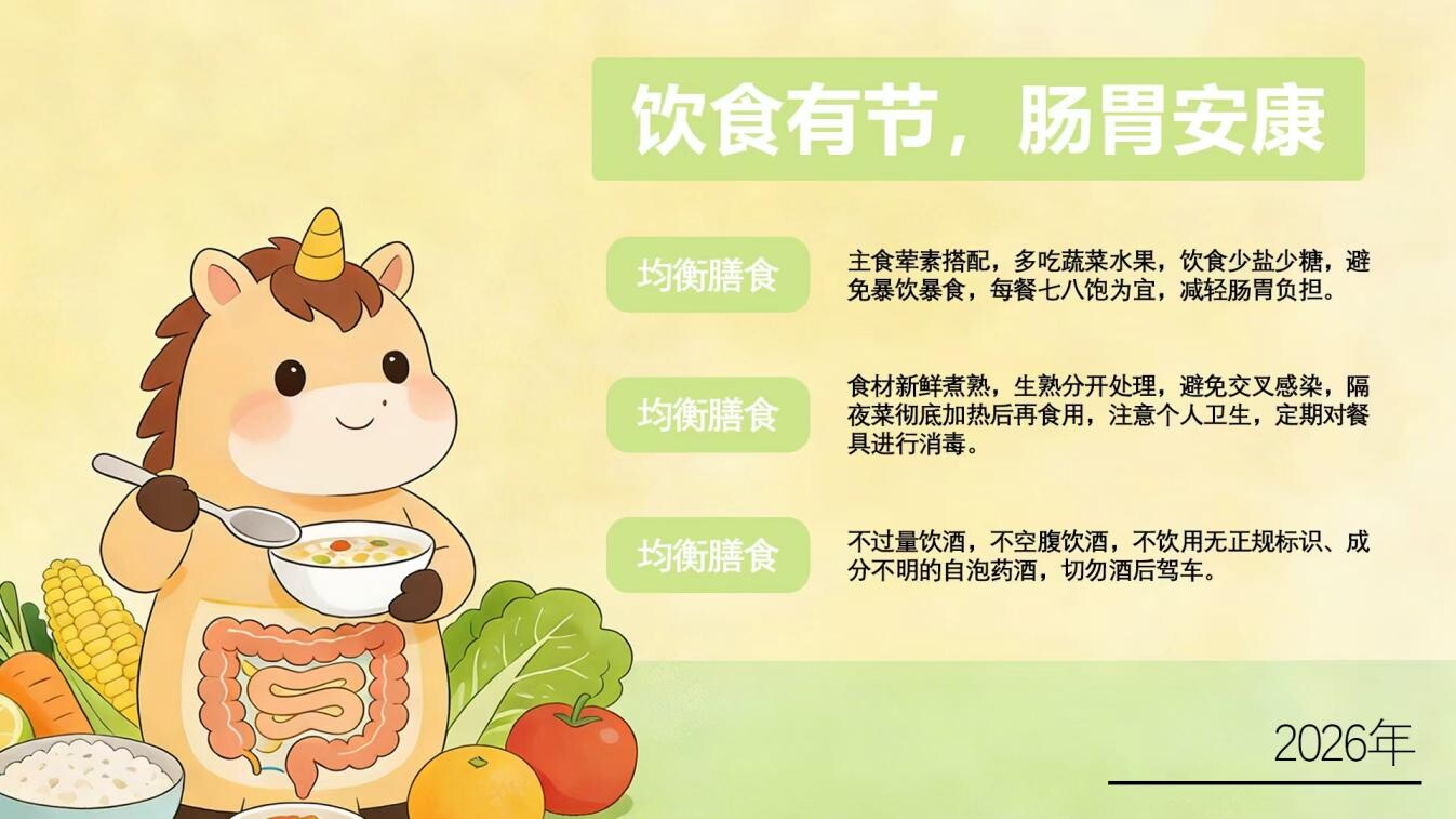 食品卫生:食材新鲜煮熟,生熟分开处理,避免交叉感染,隔夜菜彻底加热后再食用,注意个人卫生,定期对餐具进行消毒。