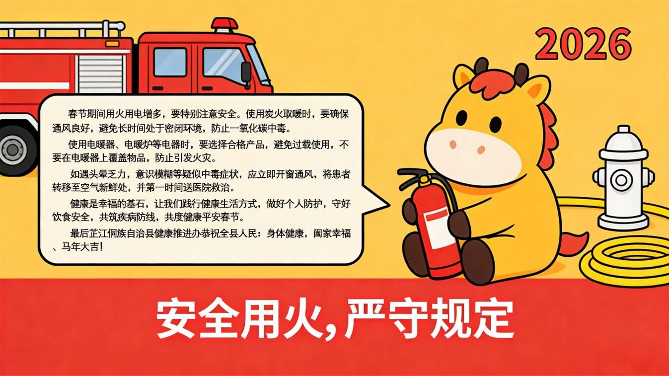 新春佳节将至,阖家团圆之际,芷江侗族自治县健康推进办在此温馨提醒大家:在欢度佳节的同时,也请不忘做好健康防护,筑牢健康防线,共同守护自己与家人的平安。以下几点健康提示请收好: