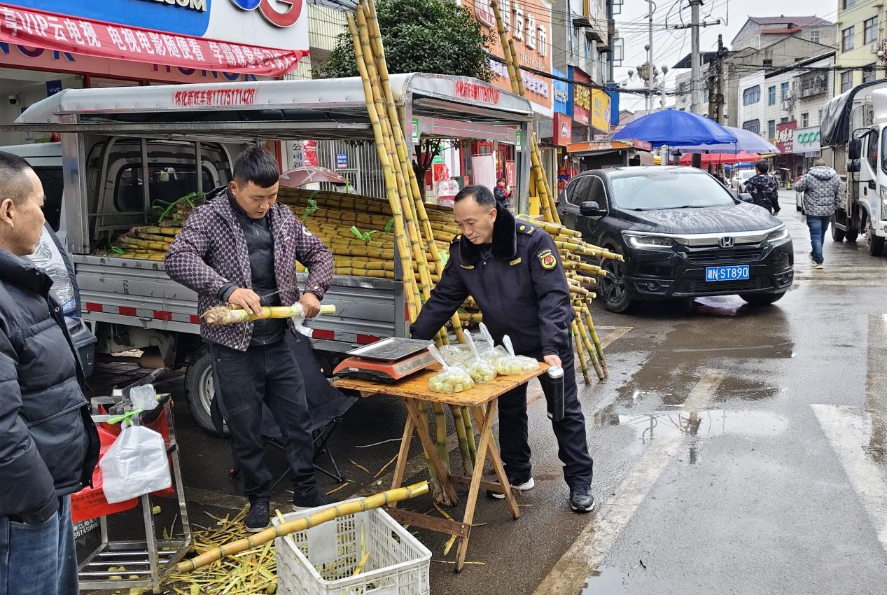 强化集市疏导秩序整治。针对集市近320国道、春节期间赶集日人流车流密集等特点,该镇在集市主要出入口及国道连接附近设置临时值守点,安排工作人员值守引导,进行阶段性人车分流与驾乘安全出行提醒,有效缓解拥堵、降低事故风险。同时,对占道经营行为采取“宣传+劝导+整治”模式,引导其进入指定区域规范经营,确保道路畅通与集市秩序。