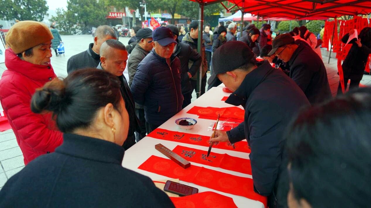 活动现场暖意融融、人气高涨。红色春联纸铺满长案,本土书法家与书法爱好者挥毫泼墨,笔走龙蛇间,一副副饱含祝福的春联跃然纸上。市民们有序等候、按需挑选,不少人现场“定制”专属吉祥语,将马年新春的美好期盼融入笔墨。