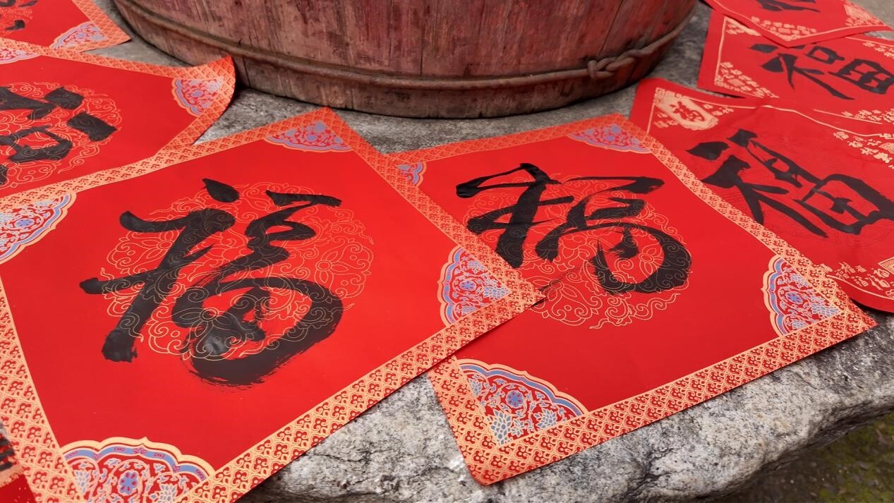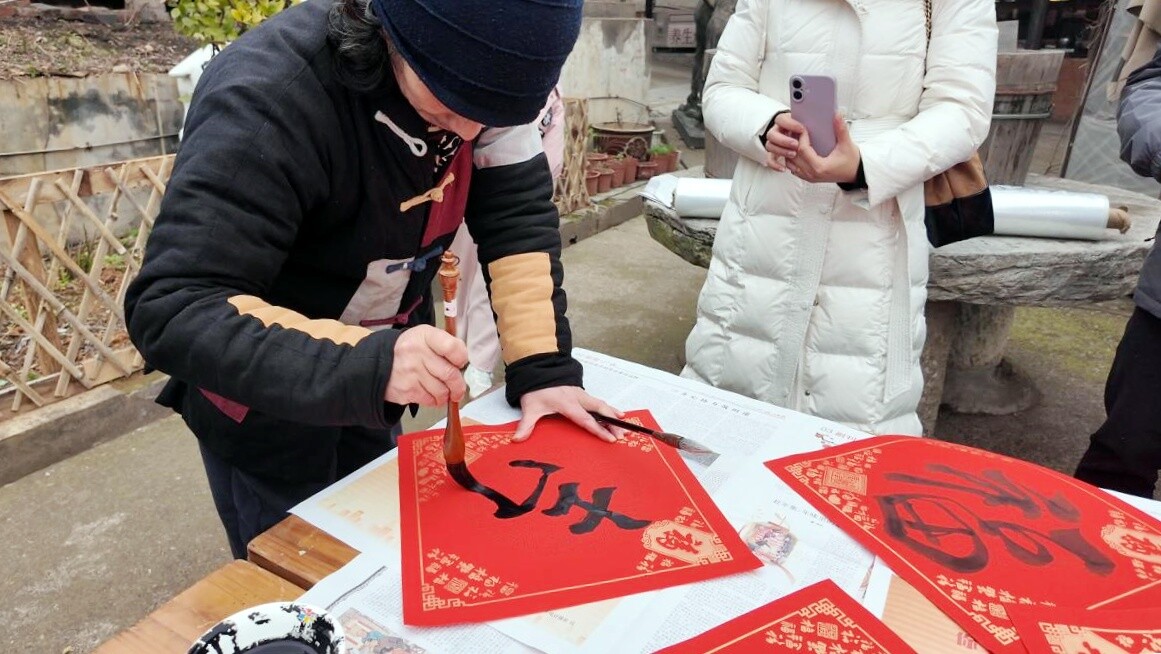 写春联现场墨香阵阵,书法爱好者们挥毫泼墨,红纸铺展,笔走龙蛇,一幅幅饱含祝福的春联、一个个喜庆的福字跃然纸上。大家围在桌前精心挑选、晾晒作品,手写春联年味十足,句句祝福传递着新春期盼。