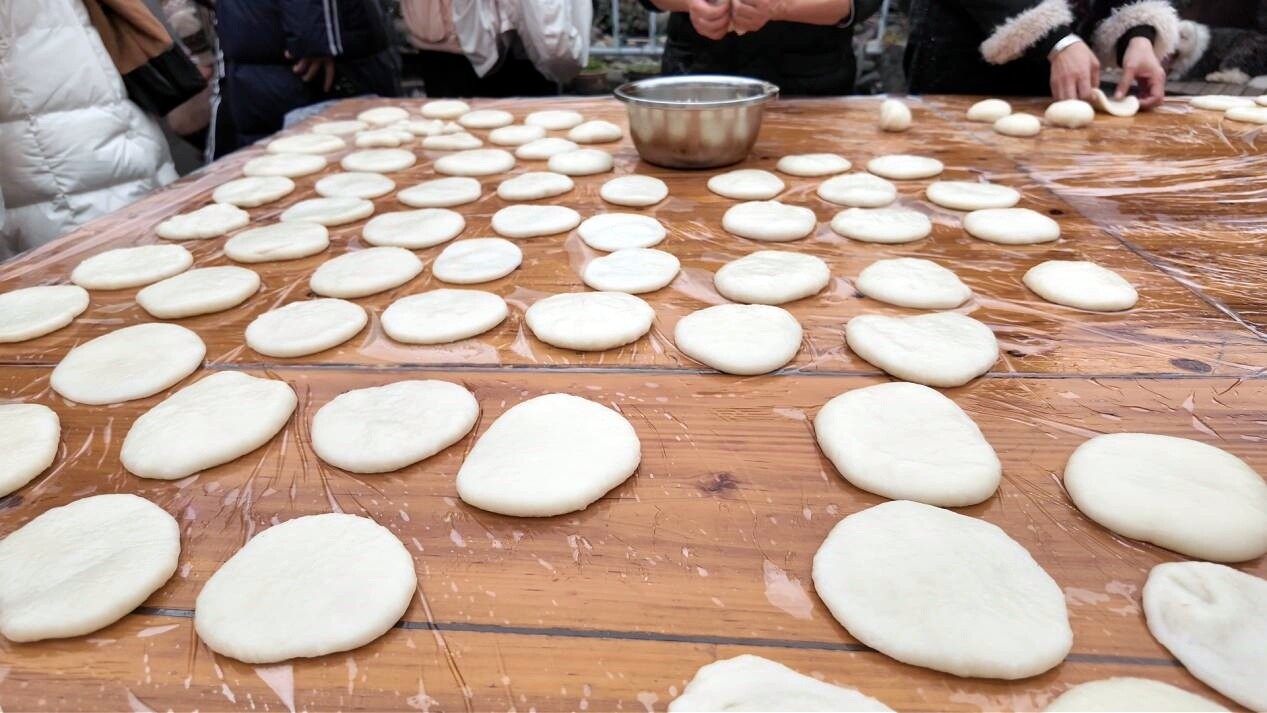 活动现场暖意融融、热闹非凡。打糍粑区域内,热气腾腾的糯米倒入石臼,大家两两搭档、抡起木槌合力捶打,木杵起落、默契配合,糯香四溢。捶打完成后,大家趁热将软糯的糍粑捏成大小均匀的团子,自然冷却定型,在协作互动中感受侗乡传统年俗,增进了团队情谊。