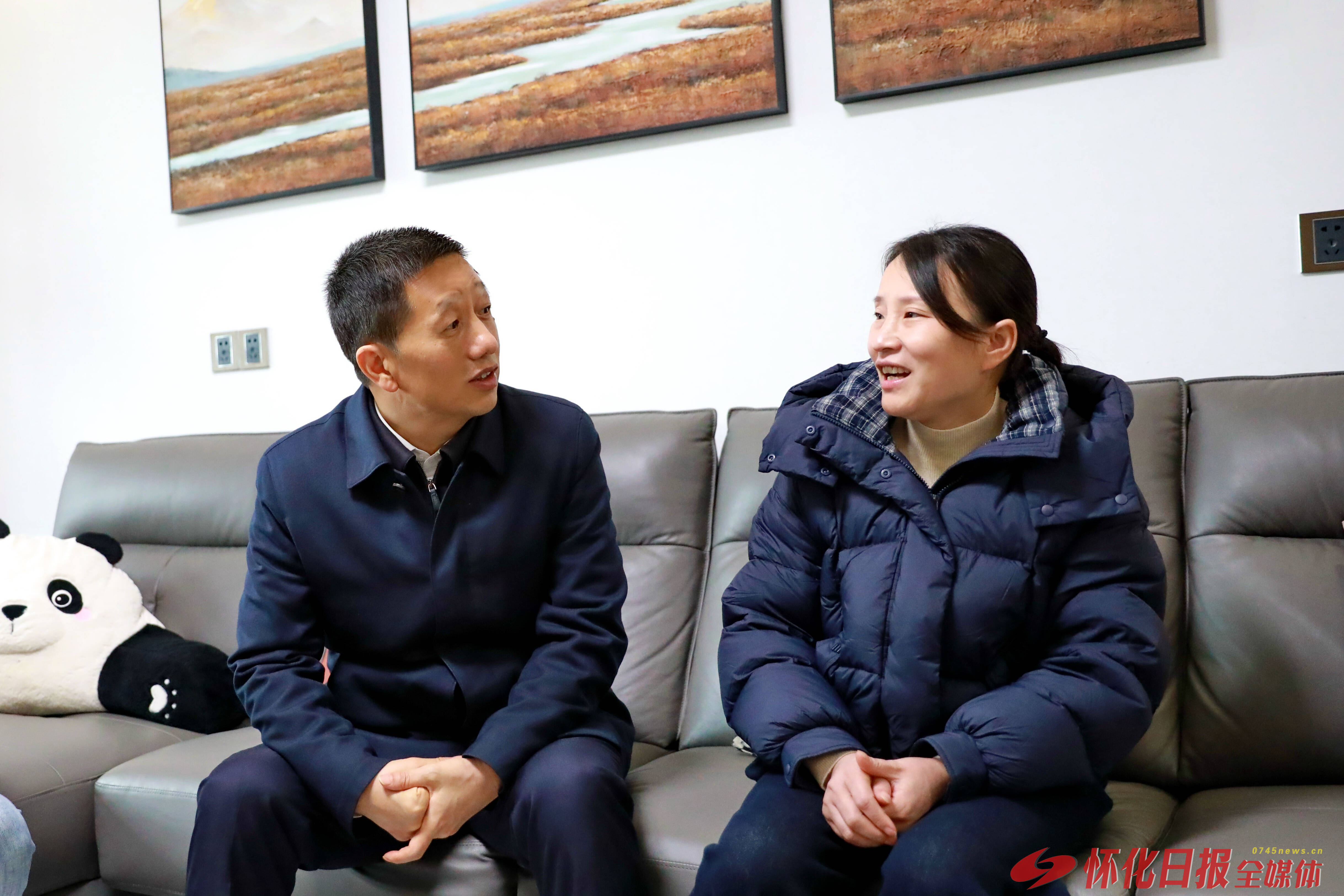 (2月11日上午,市委副书记、市长韦朝晖看望慰问困难妇女阳海鹰。怀化日报全媒体记者 吴涛 摄)