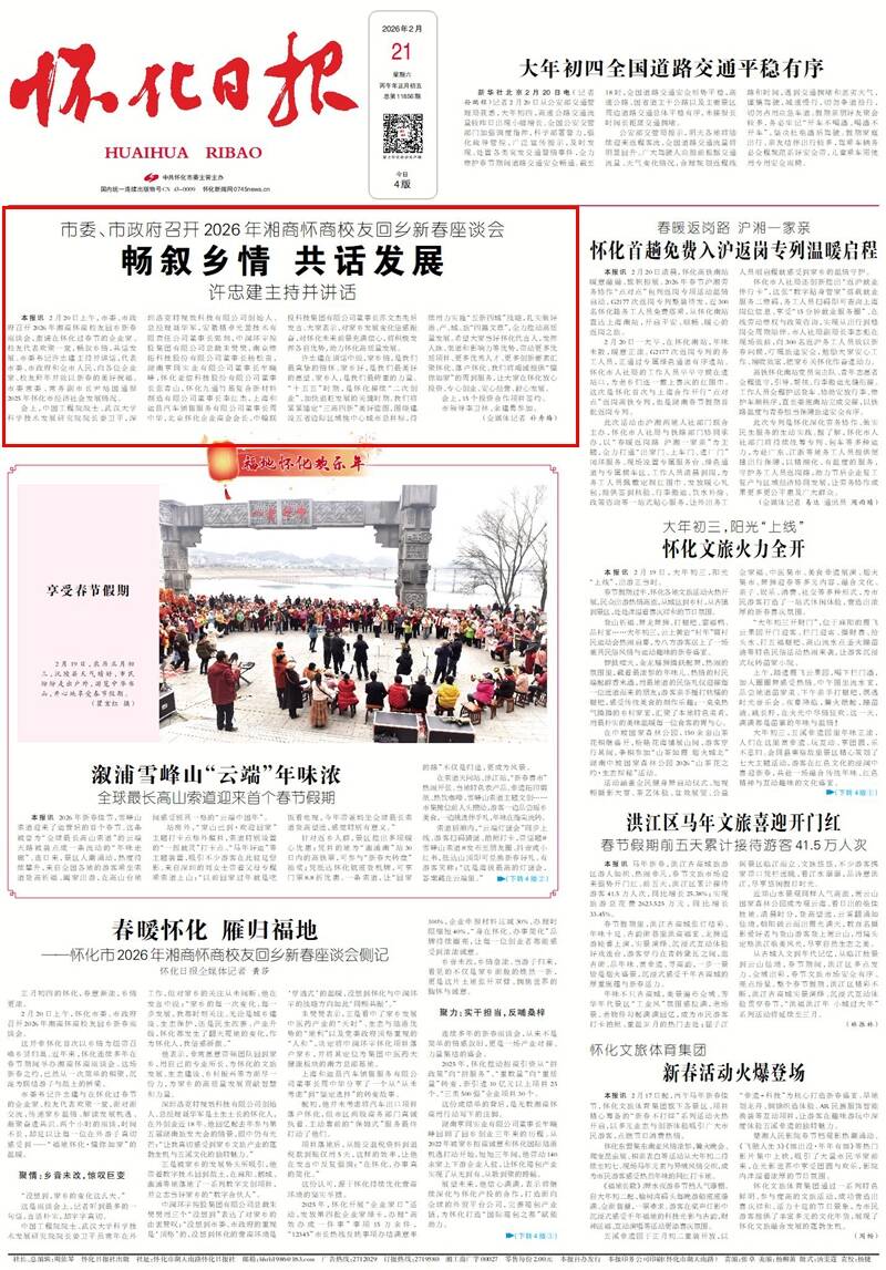 怀化日报全媒体讯 2月20日上午,市委、市政府召开2026年湘商怀商校友回乡新春座谈会,邀请在怀化过春节的企业家、校友代表欢聚一堂,畅叙乡情,共话发展。市委书记许忠建主持并讲话,代表市委、市政府和全市人民,向各位企业家、校友拜年并致以新春的美好祝福。市委常委、常务副市长尹培国通报2025年怀化市经济社会发展情况。