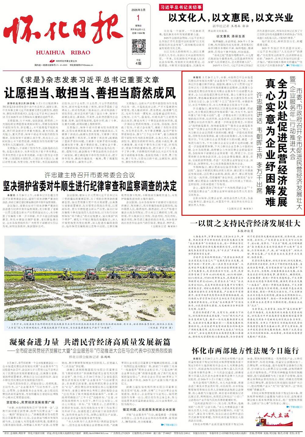 怀化日报全媒体讯 2月28日上午,市委、市政府召开全市促进民营经济发展壮大暨“企业服务年”行动推进大会。市委书记许忠建出席并讲话。他强调,要深入学习贯彻习近平总书记关于民营经济发展的重要论述精神,认真落实全省促进民营经济发展壮大暨企业服务年行动部署大会要求,全力以赴促进民营经济发展,真心实意为企业纾困解难,营造尊商重商的浓厚氛围,充分激发各类市场主体动力活力,奋力实现“十五五”良好开局。市委副书记、市长韦朝晖主持,市人大常委会主任李万千出席。