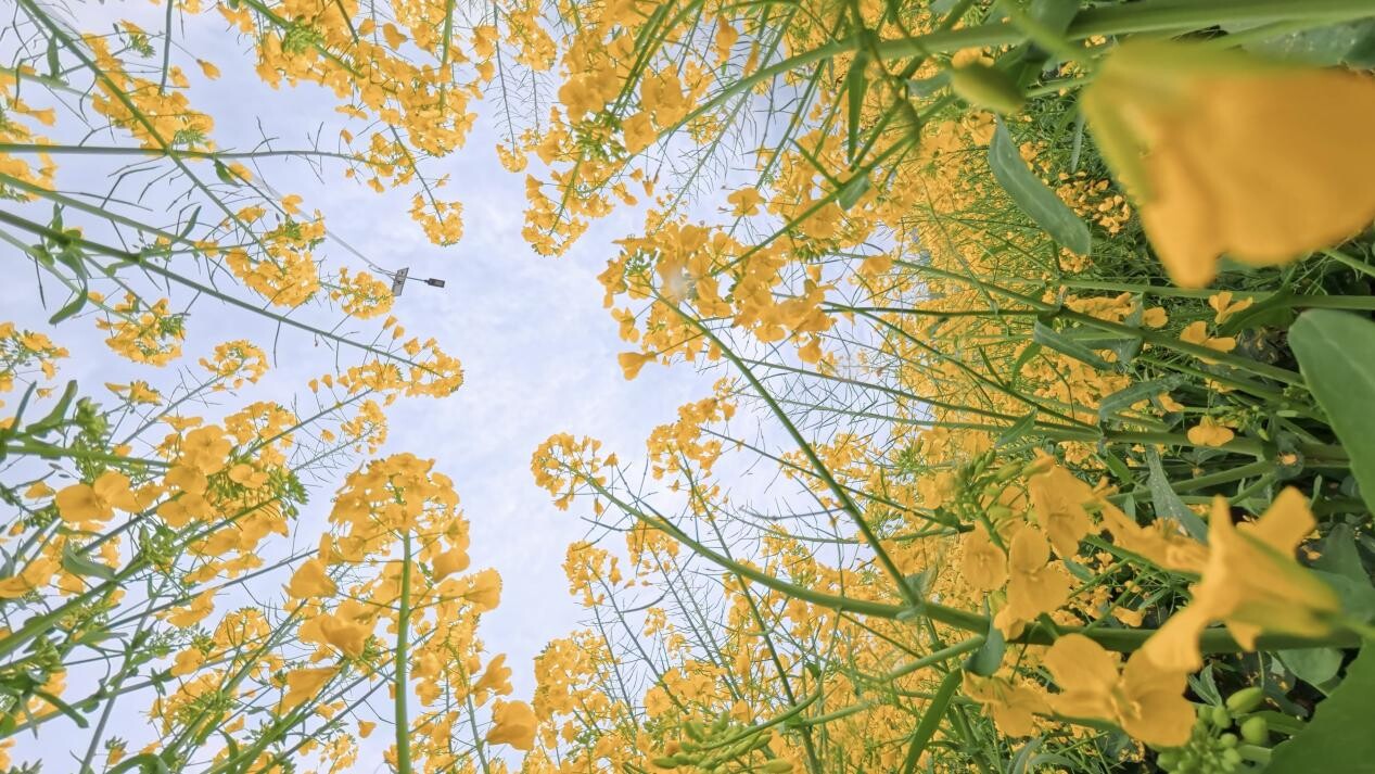 走进蜈蚣坡村,广袤田野被金黄油菜花全面覆盖,层层叠叠的花穗迎风摇曳,金浪翻滚、绵延不绝,与远处青山、村落相映成趣,勾勒出一幅清新秀美的乡村春日画卷。