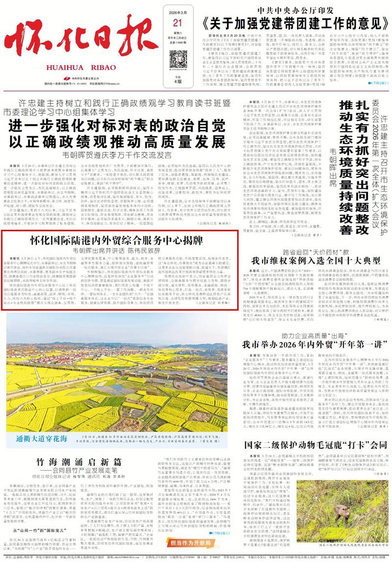 韦朝晖指出,怀化国际陆港内外贸综合服务中心揭牌启用,这是怀化深化“企业服务年”行动的创新举措,更是激活国际陆港发展动能、做强开放型经济的重要载体。我们将匠心构建一个线下中心、一个线上平台、一套工作流程、一群合作伙伴、一套培训体系、一支专业团队的“六个一”全链条服务体系,让企业可以“一站式”获取综合专业服务、链接全球资源、提升国际竞争力。怀化将持续完善服务功能、升级智慧系统、拓展合作生态,让“身在怀化、办事简化”成为企业最真实的感受,让更多企业从这里借船出海、商通天下,为湖南打造内陆地区改革开放高地贡献更多怀化力量。