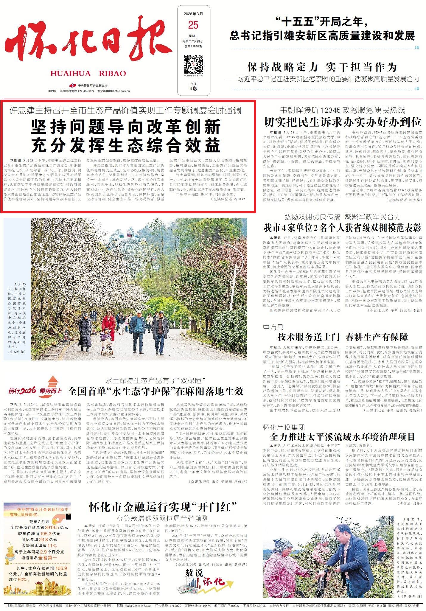 怀化日报全媒体讯 3月24日下午,市委书记许忠建主持召开全市生态产品价值实现工作调度会,听取相关情况汇报,研究部署下阶段工作。他强调,要深入学习贯彻习近平生态文明思想以及习近平总书记关于湖南工作的重要讲话和指示批示精神,认真落实党中央决策部署和省委、省政府部署要求,牢固树立和践行正确政绩观,深入践行绿水青山就是金山银山理念,切实抓好生态产品价值实现机制试点,坚持问题导向改革创新,充分发挥生态综合效益,更好支撑高质量发展。