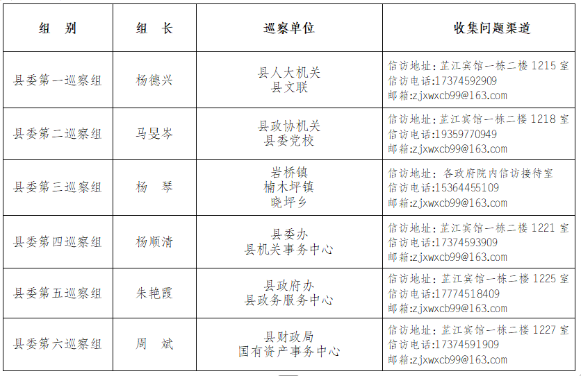 为便于干部群众反映情况,巡察组巡察期间,除设置信访举报箱外,还开通了信访电话及电子邮箱。具体如下: