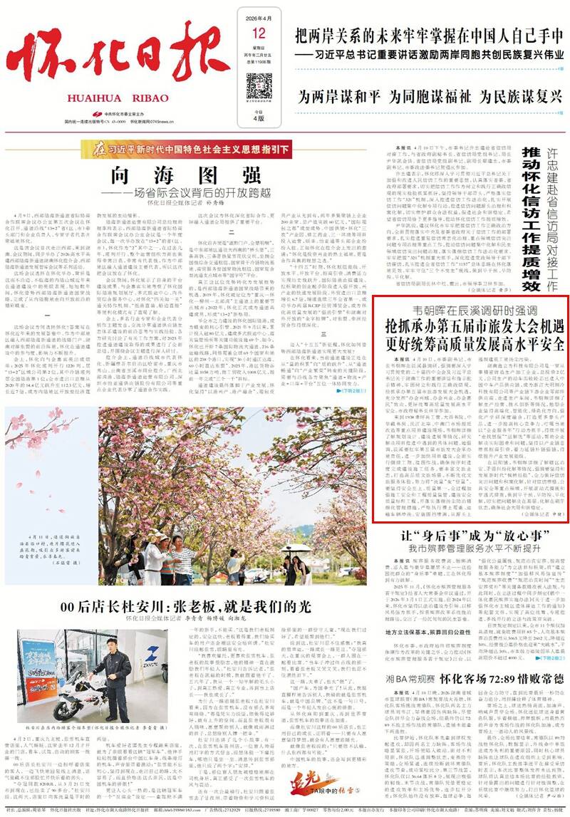 怀化日报全媒体讯 4月10日,市委副书记、市长韦朝晖在辰溪县调研,强调要深入学习贯彻党的二十届四中全会及习近平总书记关于湖南工作的重要讲话和指示批示精神,牢固树立和践行正确政绩观,抢抓承办第五届市旅游发展大会机遇,充分发挥“办会兴城、办会兴业、办会惠民”效应,更好统筹高质量发展高水平安全。市政府秘书长林华参加。