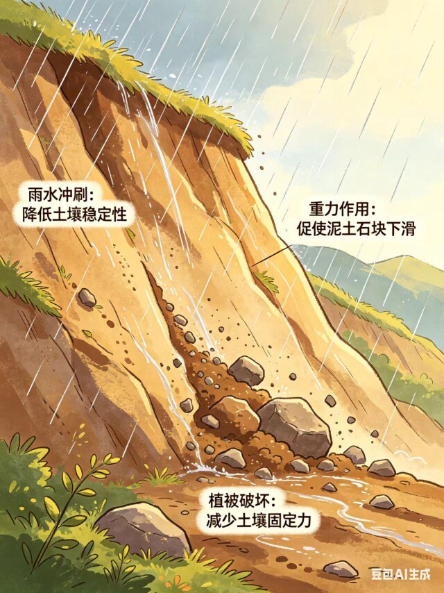 降雨是诱发滑坡的最主要因素。雨水渗入土体后,会降低岩土体强度,增加土体重量,当岩土体的抗滑力不足以支撑自身重量时,便会发生滑动。此外,切坡建房、修路等工程活动会破坏山体稳定性,大幅增加滑坡风险。