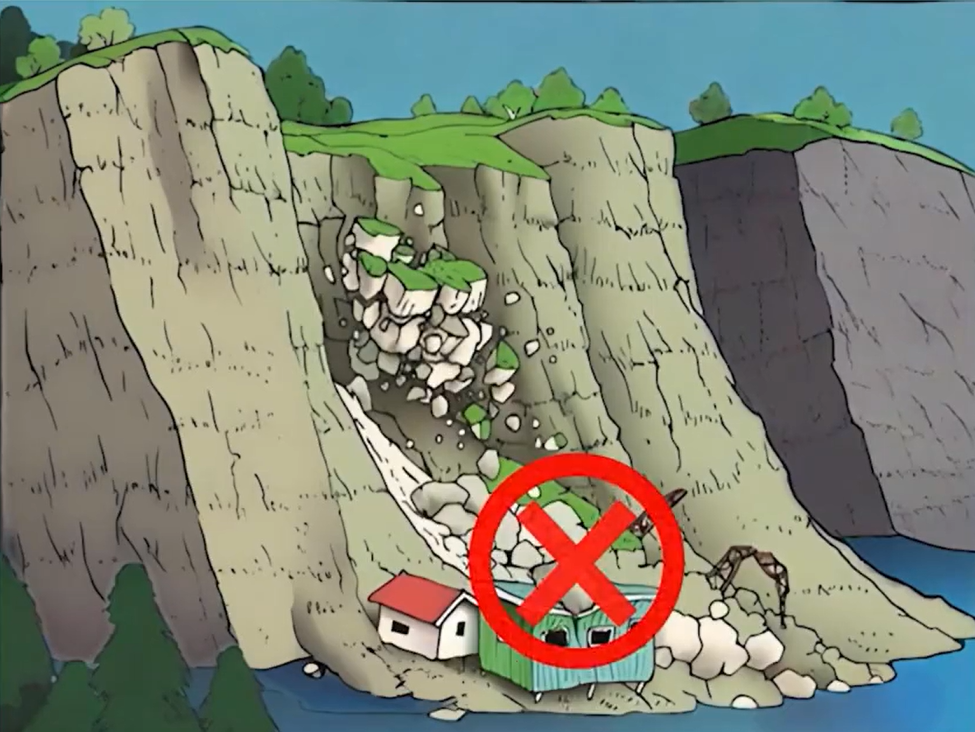 三不碰不稳定边坡,有泥岩、页岩、煤层和各种地表覆盖层存在的斜坡,易发生滑坡,坡体已有裂缝、鼓胀、渗水等异常的区域,也不要切坡。切坡建房须经专业地质评估,并做好护坡和排水系统,千万不能先建房后防护。