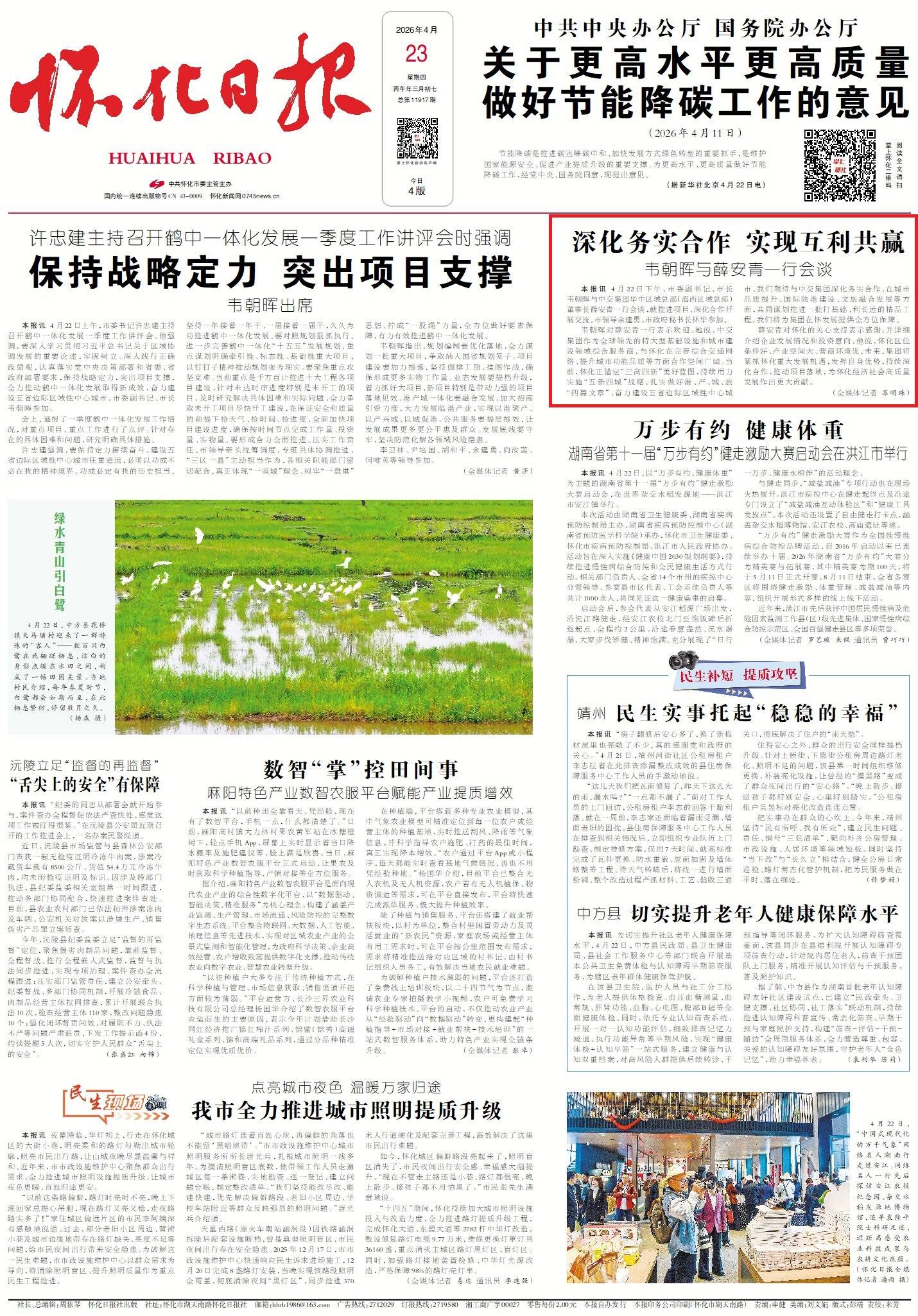韦朝晖对薛安青一行表示欢迎。她说,中交集团作为全球领先的特大型基础设施和城市建设领域综合服务商,与怀化在完善综合交通网络、提升城市功能品质等方面合作空间广阔。当前,怀化正锚定“三高四新”美好蓝图,持续用力实施“五新四城”战略,扎实做好港、产、城、旅“四篇文章”,奋力建设五省边际区域性中心城市。我们期待与中交集团深化务实合作,在城市品质提升、国际陆港建设、文旅融合发展等方面,共同谋划推进一批打基础、利长远的精品工程。我们将为集团在怀发展提供全方位保障。