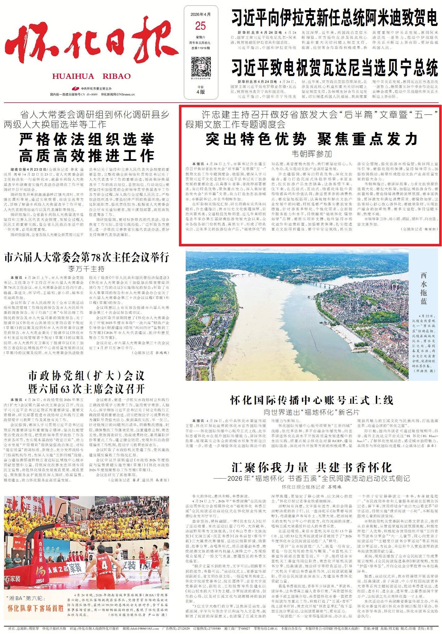 怀化日报全媒体讯 4月24日上午,市委书记许忠建主持召开做好省旅发大会“后半篇”文章暨“五一”假期文旅工作专题调度会。他强调,要深入学习贯彻习近平文化思想和习近平总书记关于旅游发展的重要论述,认真落实省委、省政府部署要求,突出特色优势,聚焦重点发力,深入做好省旅发大会“后半篇”文章,致力打造生态旅游城市。市委副书记、市长韦朝晖参加。