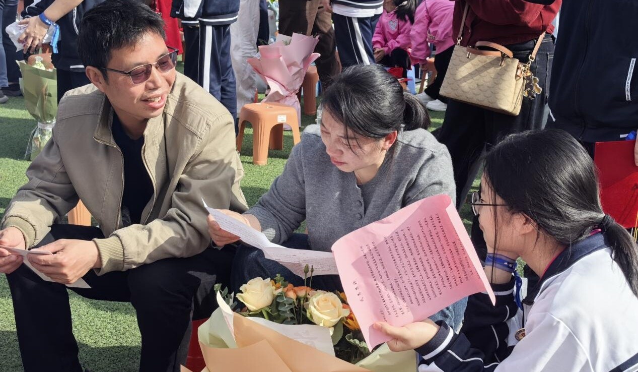 在互赠书信环节,学生与家长交换了提前写好的家书。不少学生读着父母饱含深情的字句热泪盈眶,家长们也为孩子的成长感慨万千。随后,家长们亲手为孩子拨穗,将象征着成熟的礼帽流苏从右侧拨向左侧,寓意学子已然长大成人。
