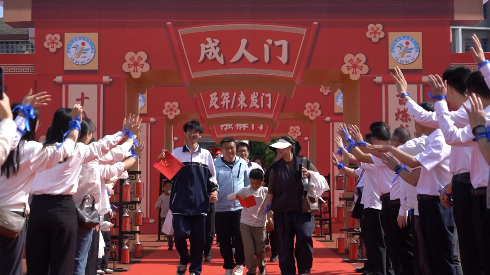 活动现场,伴随着激昂的音乐,学生与家长手挽手,依次走过“襁褓门”“及笄/束发门”“成人门”和“状元门”四道拱门。四道门象征着从婴孩到成人的成长历程,每一步都承载着父母的养育之恩与学校的殷切期望。