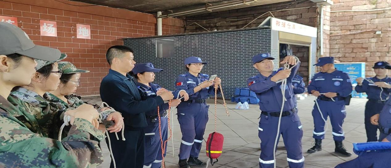 急救技能培训结束后,队员们继续开展绳索绳结技术及水上抛绳救援训练,内容涵盖绳索固定绑树、“8”字结、绳索对接结等实用打法,以及水上应急抛绳技巧等。