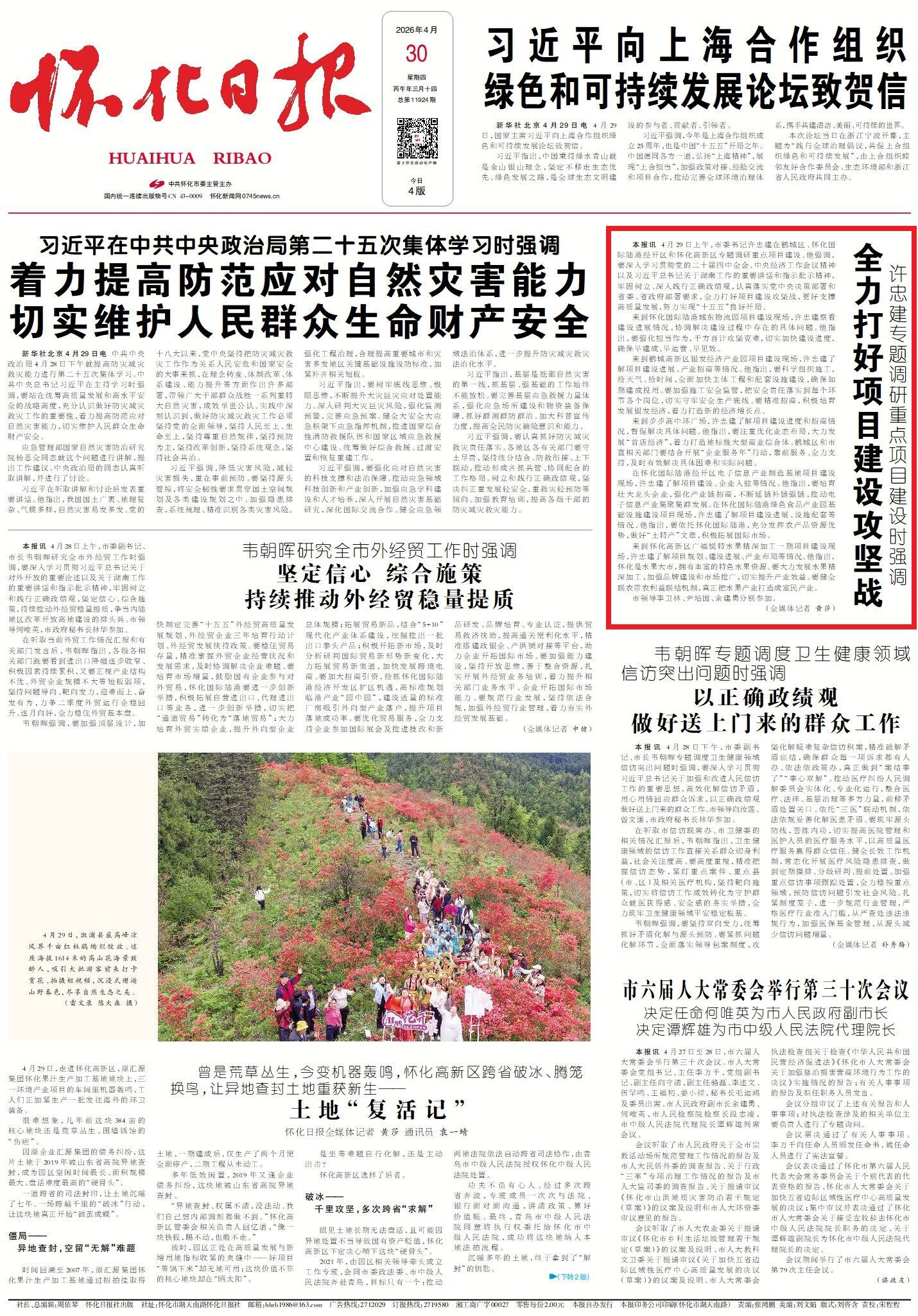 怀化日报全媒体讯 4月29日上午,市委书记许忠建在鹤城区、怀化国际陆港经开区和怀化高新区专题调研重点项目建设。他强调,要深入学习贯彻党的二十届四中全会、中央经济工作会议精神以及习近平总书记关于湖南工作的重要讲话和指示批示精神,牢固树立、深入践行正确政绩观,认真落实党中央决策部署和省委、省政府部署要求,全力打好项目建设攻坚战,更好支撑高质量发展,努力实现“十五五”良好开局。